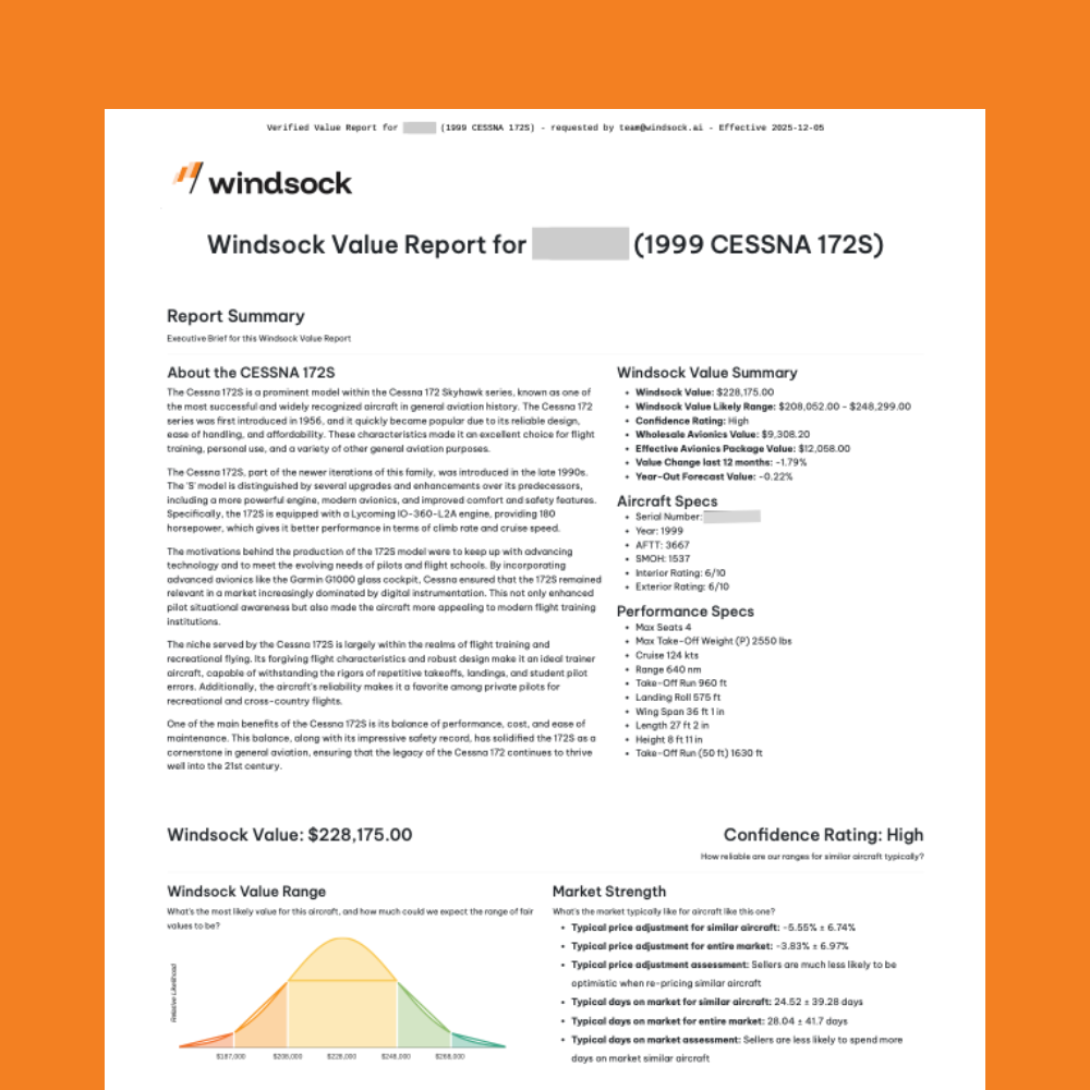 Windsock is your go-to AI aircraft valuation tool. We give you a data-backed estimate of what an aircraft could be worth, based on real-world market signals. Just smart, actionable aviation valuations for a fraction of traditional costs.